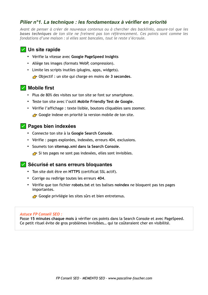 - Technique : vérifier les fondamentaux pour que ton site soit rapide, lisible et bien indexé.